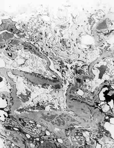 Fig. 10. Microscopia electrónica: extensos depósitos, electrón densos, de localización subendotelial y mesangial. Muy aislados subepiteliales.
