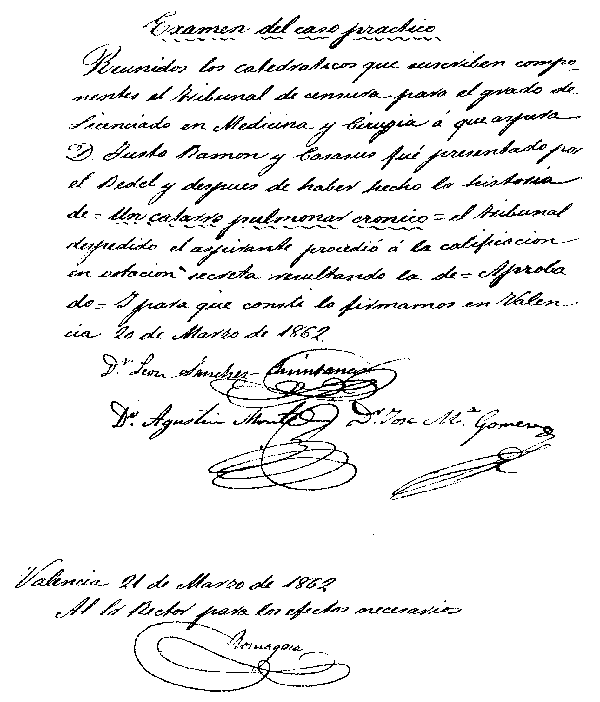 Fig. 2. Acta del examen práctico del grado de licenciado de Justo Ramón Casasús en el Hospital General de la Universidad de Valencia -20 de marzo de 1862- firmado por Sánchez Quintanar, Gómez Alamá y Morte. Al pie del acta aparece la firma del decano José Romagosa Gotzens, ordenando el envío del acta al rector.