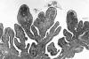 El aspecto macroscópico de ambas biopsias es el de un fragmento irregular de coloración pardusca y superficie papilar o granular, que mide de 0,8 a 1 cm. Histológicamente, se observa un tejido de arquitectura papilar (fig. 1) y en menor medida tubular (fig. 2). El epitelio de revestimiento consiste en una hilera de células cilíndricas, algunas de ellas ciliadas, debajo del cual hay un denso infiltrado inflamatorio que contiene numerosas células plasmáticas (fig. 3). Más en profundidad, se observa un estroma laxo con numerosos vasos sanguíneos de pared gruesa y fibras musculares lisas (fig. 4).