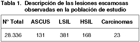 De todas las citologías examinadas, el 99,8% eran satisfactorias para evaluación, siendo el 98,8% negativas para cáncer o lesión intraepitelial y el 1,2% tenían anomalías epiteliales (tabla 1). De las citologías anómalas, el 14% eran ASCUS/AGUS, el 59% eran LSIL, el 22% eran HSIL, y el 5% Carcinomas infiltrantes (carcinoma escamoso o adenocarcinoma endocervical o endometrial).