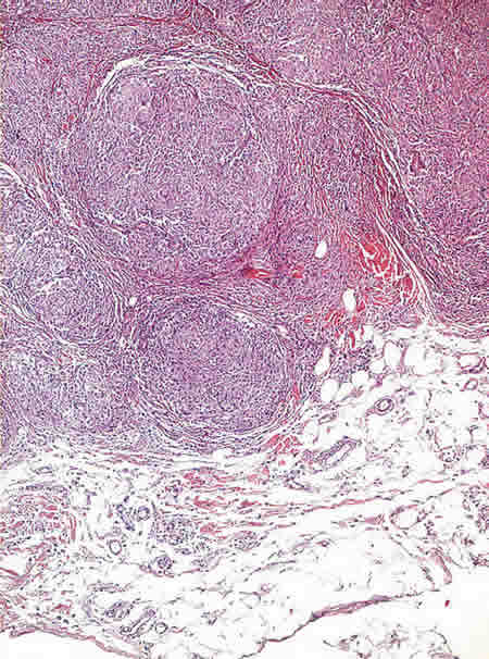 Granulomas no necrotizantes en dermis profunda e hipodermis. (H-E x200).