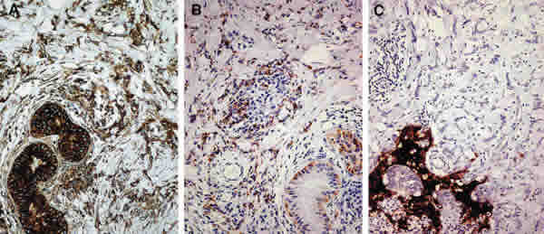 Fig. 4: Positividad intensa para Vimentina (A), moderada para citoqueratinas (B), y aislada para calretinina (C).