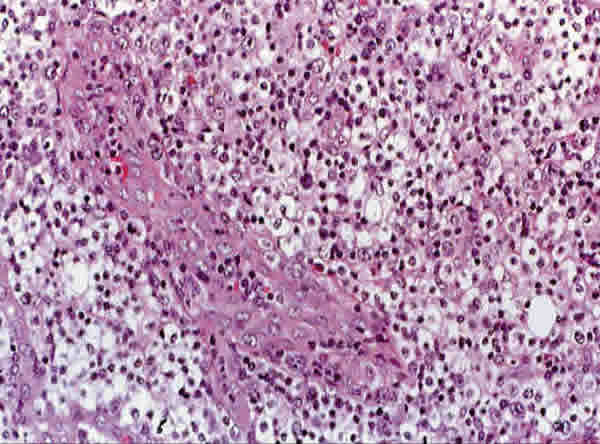 Linfoma T angioinmunblástico. Vénulas de endotelio alto rodeada de células claras.