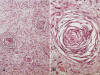 pleomorfismo nuclear con otras de aspecto más uniforme. HE 2,5x. B. Detalle