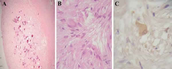 Fig. 2: A) Hamartomas subependimarios en el que se observa una proliferación glial con calcificaciones. B) A mayor aumento se observa el característico fondo fibrilar y los astrositos gigantes. C) Proteína ácida fibrilar glial positiva.