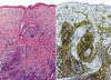 conducto de glándula sudorípara (izquierda). El CD68 es positivo de manera focal
