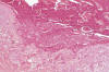 colágeno y detritus inflamatorio. Hematoxilina Eosina x100.