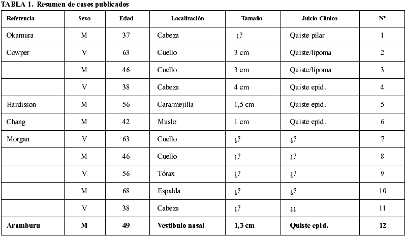 En los seis casos descritos exhaustivamente previamente (2-5), siempre se localizaban en la zona de la cabeza y cuello, afectaban a adultos de edad media, sin predominio de sexo, y se interpretaron clínicamente como «quiste de inclusión», características que concurren en nuestro caso. Además se estudiaron otros 5 casos más por Morgan y cols. (6) con el objetivo de descartar su origen mesotelial, dos de los cuales se localizaban en tronco. Los datos clínicos de los TFS cutáneos se incluyen en la tabla 1.