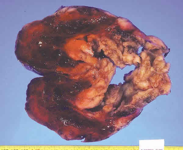 Fig. 2: El tumor aunque fragmentado, tiene aspecto lobular de superficie lisa, a la sección es brillante mucoide, con amplias áreas necróticas. En las zonas mejor conservadas el tumor es sólido, blanquecino y muy friable.