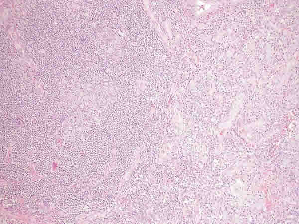Abundantes folículos linfoides en estrecha relación con la proliferación vascular. HE 20X.