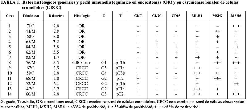 Se han utilizado para el estudio de MMRs siete ORs, seis CRCCs convencionales y un CRCC variedad eosinofílica, que han sido diagnosticados en piezas de nefrectomía en el Departamento de Anatomía Patológica. Los casos se han seleccionado retrospectivamente en el periodo 2000-2006 incluyendo ejemplos de OR de tamaños muy variables y de carcinomas de todos los grados y en todos los estadios. Antes de ser seleccionados para el estudio, cada caso ha sido reevaluado por los autores siguiendo los criterios diagnósticos al uso (1). El grado histológico se ha asignado siguiendo el sistema de Fuhrman (21) a pesar de que su utilidad haya sido puesta en cuestión recientemente (22), y el estadio según la edición de 2002 de la clasificación TNM/AJCC (23).