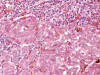 Mujer de 30 años que notó durante el embarazo un pequeño bulto supraclavicular izquierdo que aumentó de tamaño lentamente. El parto a término fue normal. En la lactancia presentó un cuadro de mastodinia con fiebre. Vista por su médico de cabecera no encontró foco para el proceso febril por lo que ante la persistencia de la tumoración supraclavicular, desde hacía tres meses, indicó su ingreso hospitalario. El resto de la exploración fue normal y no había antecedentes de interés. Se extirpó una adenopatía látero-cervical izquierda de 4 x 2,8 x 1,8 cm. El estudio histológico demostró que la lesión correspondía a un ganglio linfático infiltrado por una neoplasia maligna mal diferenciada sin pigmento melánico con células grandes con marcado pleomorfismo nuclear y presencia de nucleolos y elevado número de mitosis (fig. 1). En la valoración ultraestructural complementaria se evidenciaron premelanosomas tipo III por lo que el diagnóstico por el anatomo-patólogo (FGB) fue de melanoma metastático. No se encontró lesión primaria después de búsqueda exhaustiva en piel y mucosas por lo que fue catalogado como melanoma metastático de origen desconocido. Se realizó vaciamiento radical cervical izquierdo englobando la zona operatoria inicial que fue negativo para demostración de tumor en los ganglios disecados y tejidos blandos y se decidió seguimiento periódico sin administrar tratamiento complementario. La paciente se encuentra bien, libre de enfermedad en la última revisión 25 años desde el diagnóstico inicial. En una revisión posterior se comprobó con técnicas inmunohistoquímicas (IHQ) la positividad de las células tumorales para HMB-45, melan-A y S-100 lo que verifica el acertado diagnóstico histológico inicial de melanoma (figs. 2 y 3).