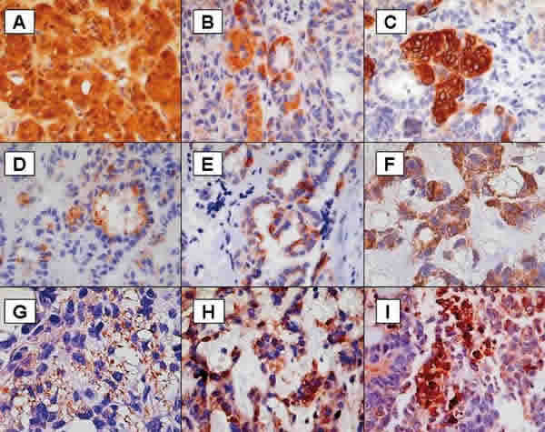 Fig. 4: Expresión inmunofenotípica múltiple de las células neoplásicas. A. proteína S100, B Melan-A, C. GFAP, D. EMA, E. Citoqueratina AE1/3, F. HMB-45, G. Neurofilamento, H. Desmina, I. Sinaptofisina.